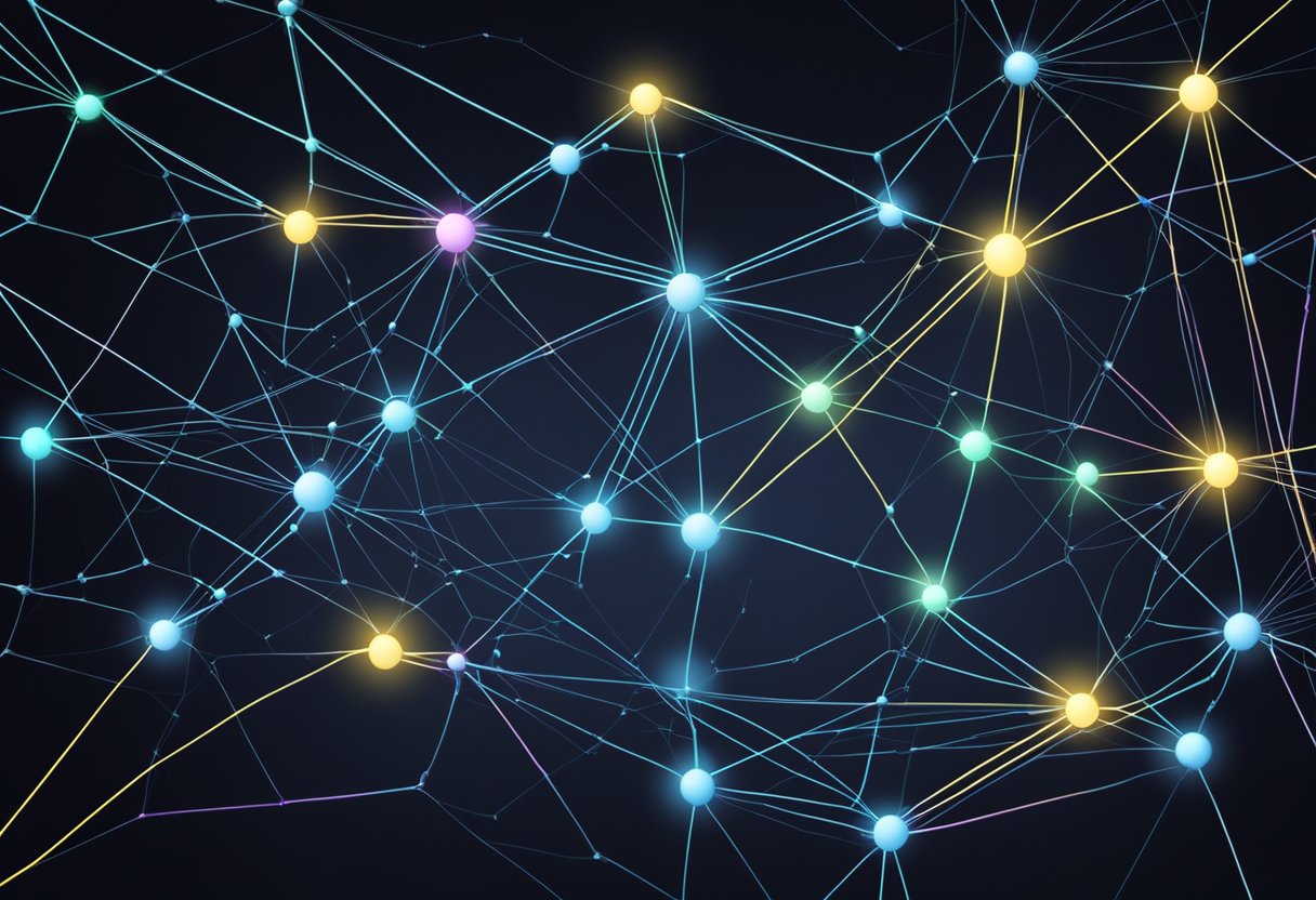 A network of nodes connected by glowing lines resembling a web, set against a backdrop.